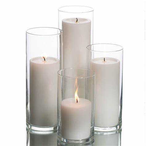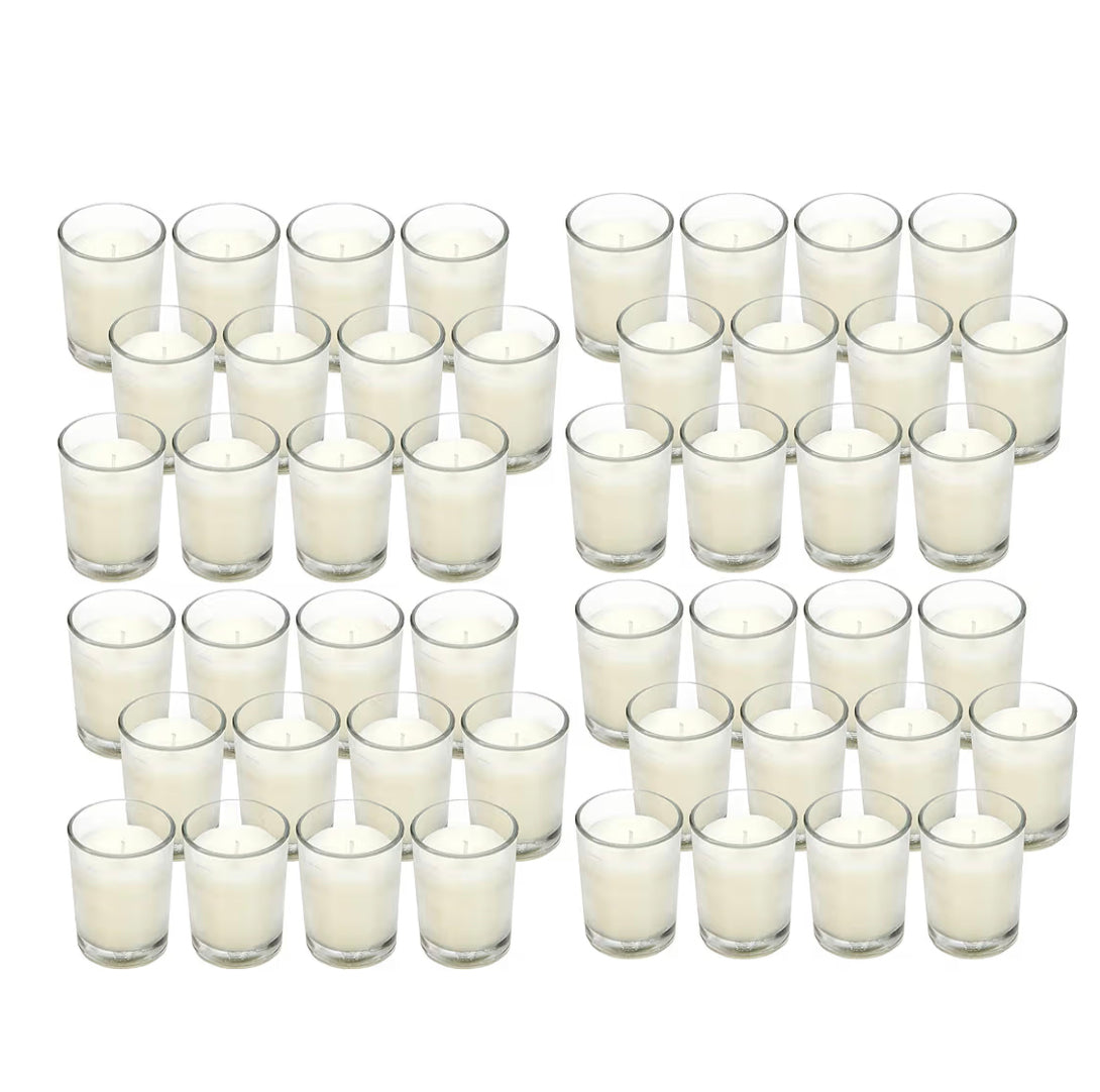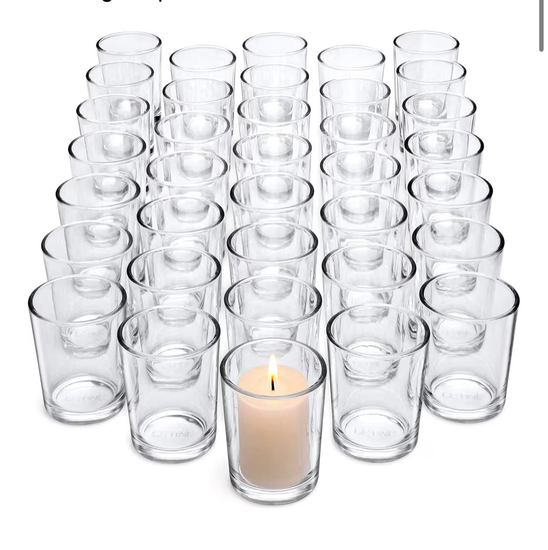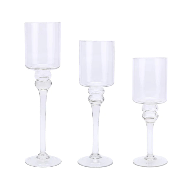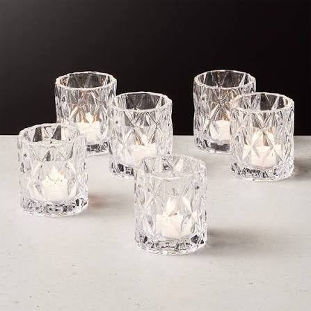 Assorted clear glass and gold candle holders: votives, tapers, and cylinders